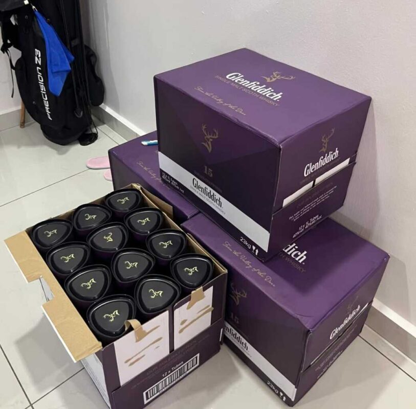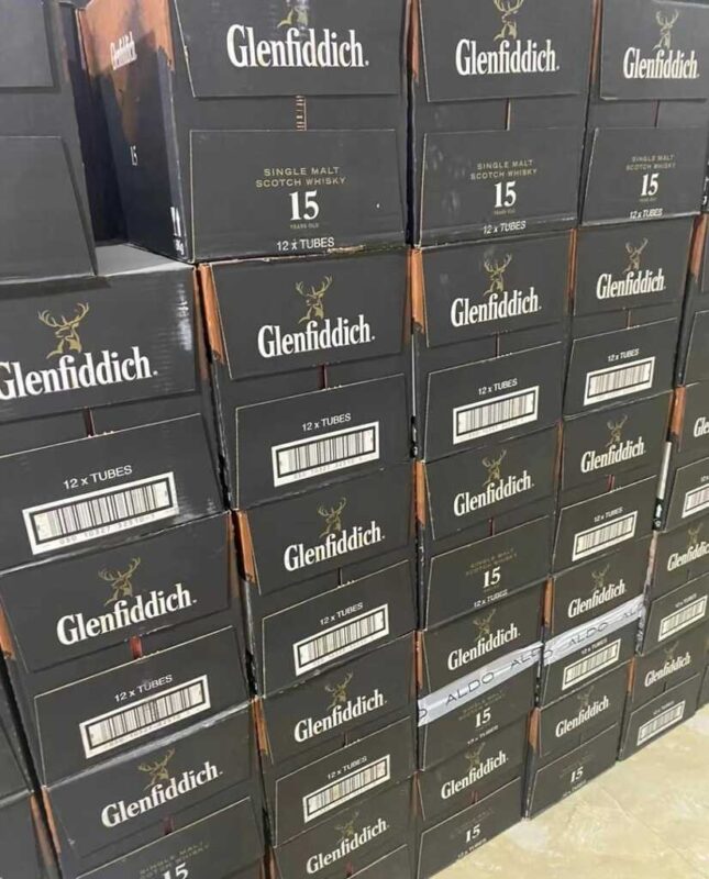 Glenfiddich whisky bottles arranged for wholesale export with branded cartons